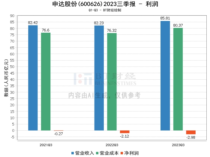 在利润方面,2023年三季度,申达股份的营业收入为85.81亿元,较上年同期的82.23亿元有所增长。营业成本为80.37亿元,较上年同期的76.32亿元增加。然而,在本报告期,归属于上市公司股东的净利润为-9951.4万元,较上年同期的1371.65万元大幅下降,主要原因为公司整体利息费用上升,北美工厂劳动力短缺等原因造成运营成本大幅上升。