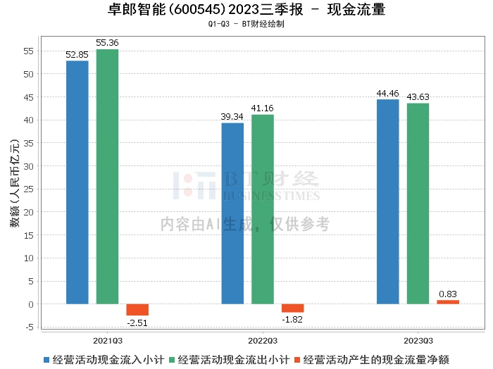 在现金流量方面,卓郎智能2023年三季度的经营活动产生的现金流量净额为8268.4万元,较上年同期的-1.82亿元有显著改善。经营活动现金流入小计为44.46亿元,较上年同期的39.34亿元有所增长。经营活动现金流出小计为43.63亿元,较上年同期的41.16亿元有所增长。