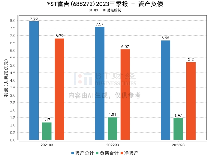 在资产负债方面,本报告期末,*ST富吉的总资产为6.66亿元,相比上年度末的7.49亿元有所下降。负债合计为1.47亿元,较上年度末的1.65亿元有所减少。公司的净资产为5.2亿元,较上年度末的5.84亿元有所减少。资产负债率为22.05%,与上年度末相同。