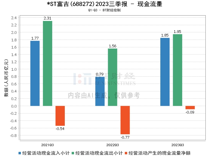 在现金流量方面,年初至本报告期末,*ST富吉的经营活动现金流入小计为1.85亿元,较上年同期的7917.41万元有所增加。经营活动现金流出小计为1.95亿元,较上年同期的1.56亿元有所增加。经营活动产生的现金流量净额为-947.67万元。
