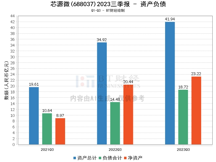 从资产负债方面来看,芯源微2023年三季度末的总资产为41.94亿元,相比上年度末的34.96亿元增长了19.96%。负债合计为18.72亿元,相比上年度末的13.9亿元增长了34.55%。净资产为23.22亿元,相比上年度末的21.07亿元增长了10.10%。资产负债率为44.63%,相比上年度末的39.75%有所上升。