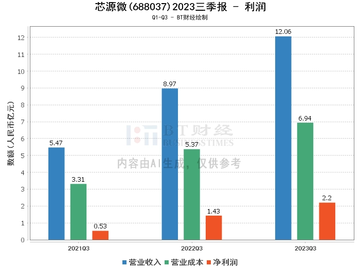在利润方面,芯源微2023年三季度的营业收入为12.06亿元,相比上年同期的8.97亿元增长了34.55%。营业利润为2.5亿元,相比上年同期的1.24亿元增长了101.61%。净利润为2.2亿元,相比上年同期的1.43亿元增长了53.98%。这些数据的增长主要系公司产品竞争力不断增强,收入规模持续增长。