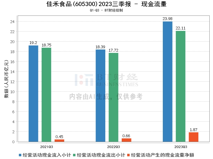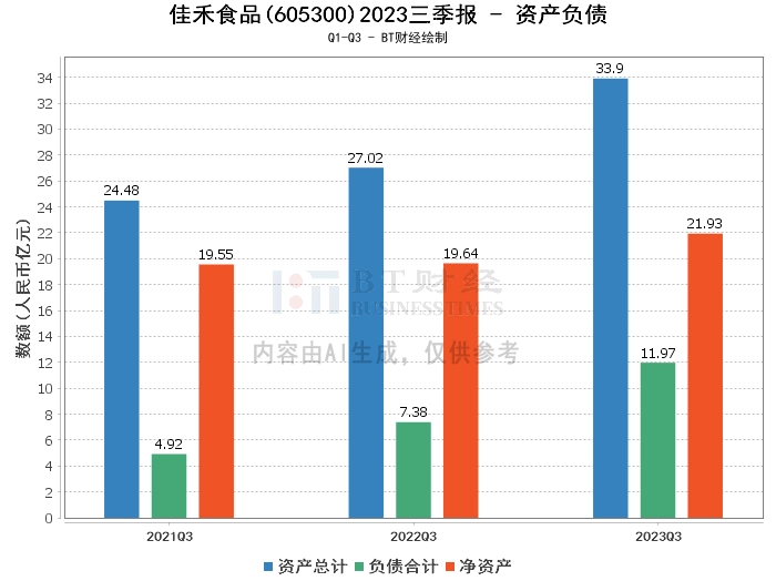 在资产负债方面,佳禾食品2023年三季度末的总资产为33.9亿元,相比上年度末的31.11亿元有所增长。负债合计为11.97亿元,相比上年度末的10.9亿元也有所增加。净资产为21.93亿元,相比上年度末的20.22亿元有所提升。资产负债率为35.32%,相比上年度末的35.02%略有增加。