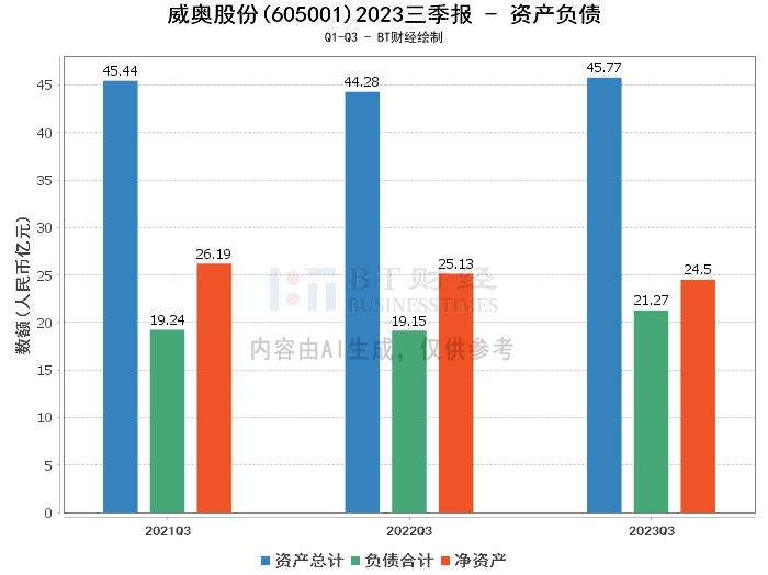 从资产负债方面来看,2023年三季度末,威奥股份的总资产为45.77亿元,相比上年度末的44.45亿元有所增长。负债合计为21.27亿元,相比上年度末的19.33亿元也有所增加。净资产为24.5亿元,相比上年度末的25.12亿元有所减少。资产负债率为46.47%,相比上年度末的43.5%有所上升。
