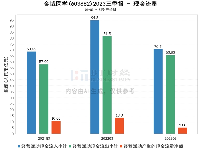 在现金流量方面,金域医学2023年三季度的经营活动产生的现金流量净额为5.08亿元,相比上年同期的13.3亿元有所减少。经营活动现金流入小计为70.7亿元,相比上年同期的94.8亿元有所减少。经营活动现金流出小计为65.62亿元,相比上年同期的81.5亿元有所减少。