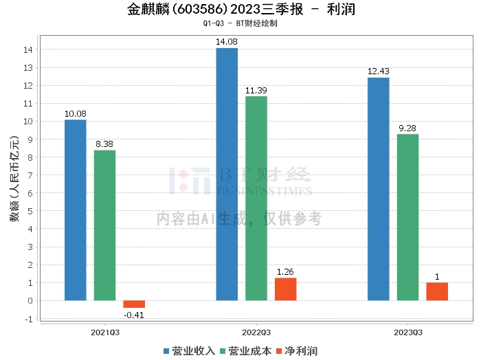 在利润方面,金麒麟2023年三季度的营业收入为12.43亿元,较上年同期的14.08亿元有所减少。营业利润为1.22亿元,较上年同期的1.58亿元有所下降。营业成本为9.28亿元,较上年同期的11.39亿元减少。净利润为1亿元,较上年同期的1.26亿元有所减少。这主要系本报告期主营产品销量减少所致。
