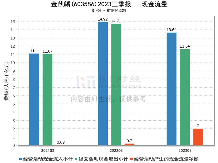 在现金流量方面,金麒麟2023年三季度的经营活动产生的现金流量净额为2亿元,较上年同期的2007.54万元大幅增长,主要系本报告期购买原材料支出减少所致。经营活动现金流入小计为13.64亿元,较上年同期的14.92亿元有所减少。经营活动现金流出小计为11.64亿元,较上年同期的14.71亿元减少。