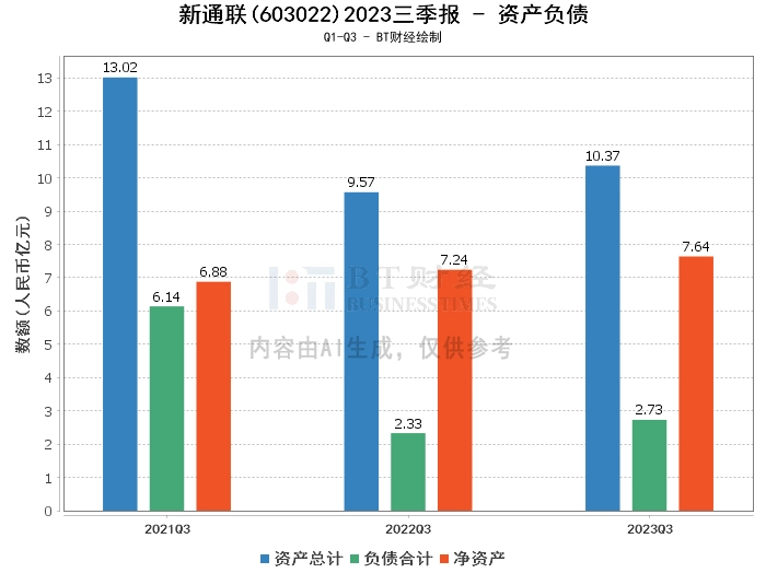从资产负债方面看,新通联2023年三季度的总资产为10.37亿元,相较于上年度末的10亿元,增长了3.66%。负债合计为2.73亿元,略高于上年度末的2.68亿元。净资产为7.64亿元,较上年度末的7.32亿元有所增加。资产负债率为26.34%,较上年度末的26.84%有所下降。