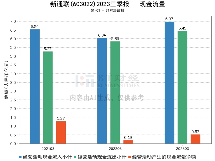 在现金流量方面,新通联2023年三季度经营活动产生的现金流量净额为5201.42万元,同比大幅增长174.59%,主要是报告期内收入增加,盈利增加所致。经营活动现金流入小计为6.97亿元,经营活动现金流出小计为6.45亿元。