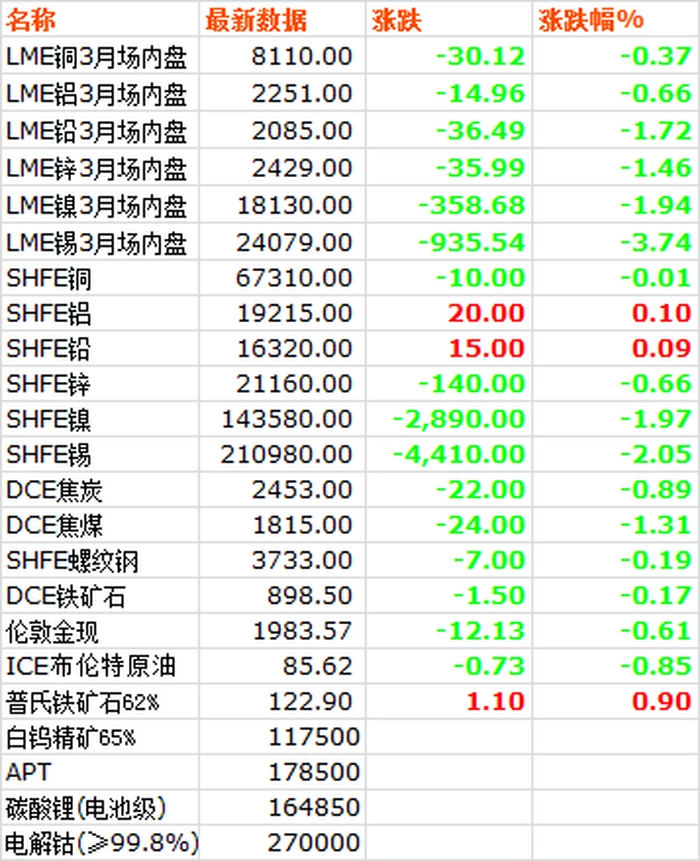 10月31日,LME六种基本金属价格全线下跌,锡领跌,锡镍铅锌跌幅较大。三月期铜价冲高回落,收于8110.5美元/吨,下跌0.37%。三月期铝价收于2251.5美元/吨,下跌0.66%。三月期铅价日内连续回落,收于2085美元/吨,下跌1.72%。三月期锌价先扬后抑,收于2429.5美元/吨,下跌1.46%。三月期锡价收于24079美元/吨,下跌3.74%。三月期镍价收于18130美元/吨,下跌1.94%。