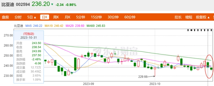 前三季度,比亚迪业绩保持高速增长态势,总营收4222.75亿元,同比增长58%,实现归母净利润213.67亿元,同比大幅提升约130%。如此亮眼的业绩却因巴菲特的套现2亿港元而让比亚迪在财报发布后股价两连跌,分别为10月31日下跌2.48%和11月1日下跌0.98%。