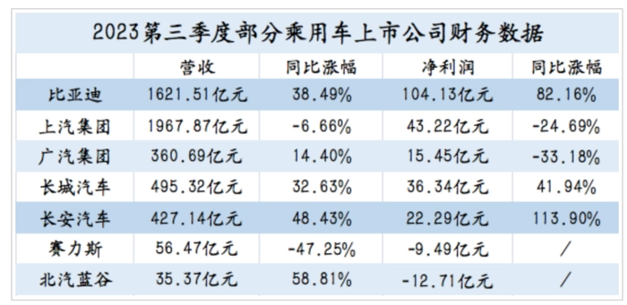 净利润增幅最高的是长安汽车,第三季度营收427.14亿元,同比增长48.43%,净利润22.29亿元,同比增长113.9%。