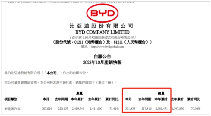 比亚迪在2023年的销量目标是300万辆,前9个月已经售出207.96万辆,也就是说剩下的三个月,比亚迪需要完成93万辆的销售任务,平均每月31万辆。公开数据显示比亚迪7月销量为26.2万辆,8月销量为27.4万辆,9月销量28.75万辆,第一季度销量达到了55万辆,第二季度为70万辆,第三季度更是达到了82万辆。前三季度销量环比增长分别为27%和17%,以每月销量环比增速,以及前三季度销量的增速来看,比亚迪方面也对300万辆的销售目标任务较为乐观。此前比亚迪公告也透露,比亚迪10月销售301833辆,同比增长38.6%,全力冲击年度目标。
