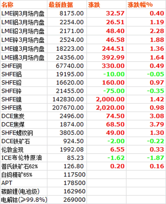 11月3日,LME六种基本金属价格全线上涨,铅锌领涨大盘。三月期铜价探底回升,收于8175.5美元/吨,上涨0.40%。三月期铝价震荡上行,收于2254美元/吨,上涨1.19%。三月期铅价日内持续上行,收于2171.5美元/吨,上涨2.28%。三月期锌价先抑后扬,收于2524.5美元/吨,上涨1.88%。三月期锡价收于24356美元/吨,上涨1.64%。三月期镍价收于18223美元/吨,上涨1.36%。