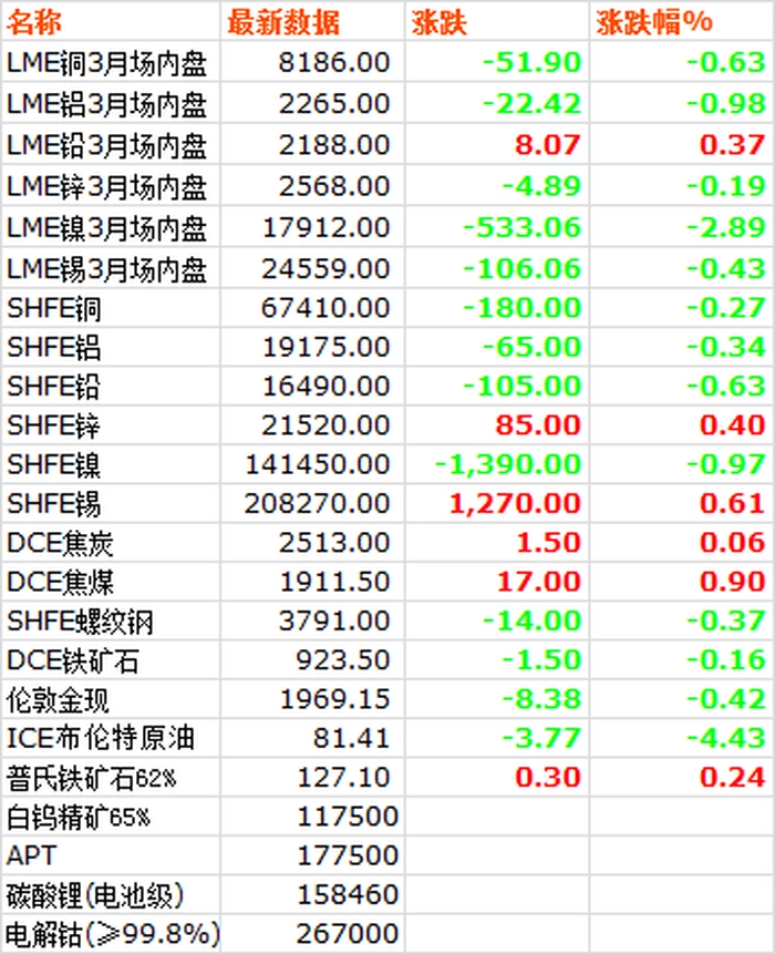 11月7日,LME六种基本金属价格跌多涨少,镍跌幅较大。三月期铜价探底回升,收于8186.5美元/吨,下跌0.63%。三月期铝价探底回升,收于2265美元/吨,下跌0.98%。三月期铅价先抑后扬,收于2188.5美元/吨,上涨0.37%。三月期锌价收于2568美元/吨,下跌0.19%。三月期锡价收于24559美元/吨,下跌0.43%。三月期镍价收于17912美元/吨,下跌2.89%。