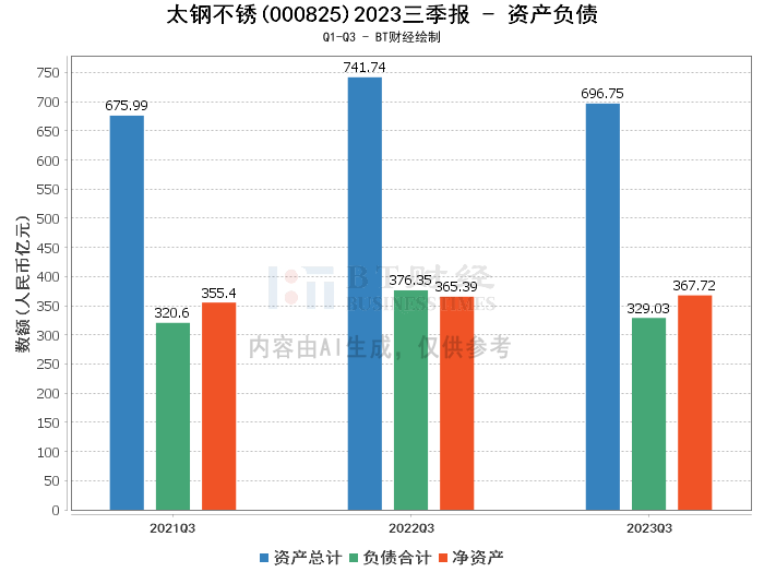 在2023年三季度,太钢不锈面临全球经济增速放缓及国内经济复苏不及预期的双重挑战。尽管如此,公司仍坚持特钢发展方向,努力维持行业领先地位。财务数据显示,截至本报告期末,公司总资产为696.75亿元,相比上年度末的728.59亿元下降了4.37%。负债合计为329.03亿元,较上年度末的355.11亿元减少了7.34%。净资产为367.72亿元,较上年度末的373.48亿元略有下降。资产负债率为47.22%,较上年度末的48.74%有所下降,显示出公司财务结构有所改善。