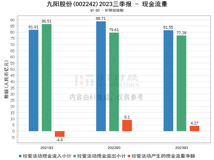 现金流量方面,九阳股份的经营活动产生的现金流量净额从上年同期的9.1亿元大幅减少至4.27亿元,下降了53.06%。