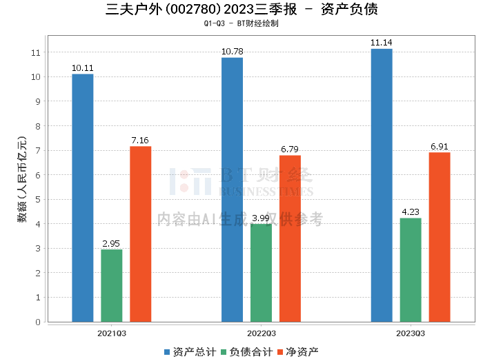 从资产负债方面来看,三夫户外的总资产由上年度末的10.71亿元增长至本报告期末的11.14亿元,增长了4.01%。负债合计也有所增加,从上年度末的3.87亿元上升至本报告期末的4.23亿元。尽管负债有所增长,净资产也从6.84亿元增至6.91亿元,资产负债率略有上升,从36.13%增至37.96%。这些变化反映了公司在维持资产增长的同时,也适度增加了负债以支持其业务扩展。