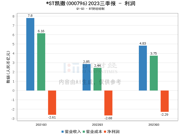 *ST凯撒(股票代码:000796)作为一家涉足旅游及生活服务领域的综合服务商,其2023年三季报显示了公司在业务恢复背景下的财务状况和经营动态。凯撒旅游和凯撒易食两大业务板块构成了公司的核心竞争力,覆盖全球152个国家和地区的全品类旅游服务以及健康品味生活服务,为政府、企业和个人客户提供了广泛的选择。