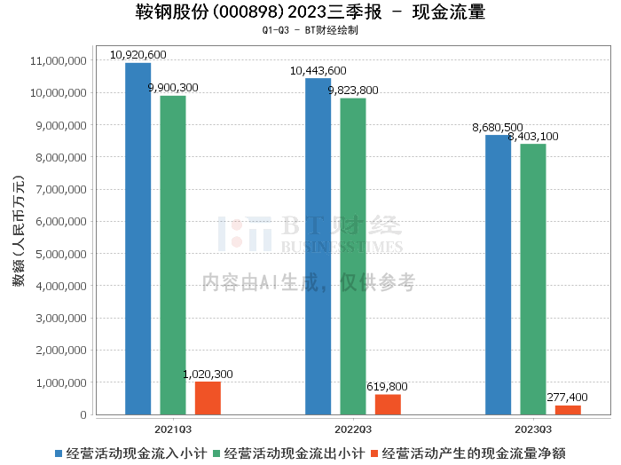 综上所述,鞍钢股份在2023年三季度虽面临行业调整的挑战,但通过有效的成本控制和现金流管理,保持了企业的稳定运营。公司的资产负债结构保持稳定,尽管利润指标受到市场周期性波动的影响,但现金流量净额的减少显示出公司在经营活动中的现金流入有所下降,但现金流出的控制显示出公司在财务管理上的努力。