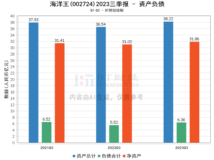 资产负债方面,海洋王2023年三季度报告显示,公司总资产由上年度末的38.65亿元微降至38.22亿元,负债合计从7.6亿元减少至6.36亿元,净资产则从31.05亿元增长至31.86亿元。资产负债率有所改善,从19.67%降至16.64%,显示公司的财务结构更为稳健。