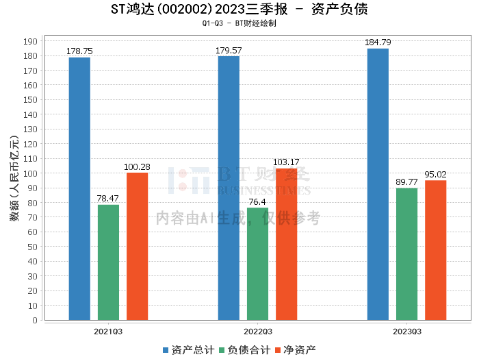从资产负债方面来看,ST鸿达2023年三季度报告显示,公司的总资产从上年度末的187.87亿元减少至184.79亿元,下降了1.64%。负债合计从上年度末的84.65亿元增加至89.77亿元,增长了约6.05%。净资产从上年度末的103.22亿元减少至95.02亿元,下降了7.92%。资产负债率从上年度末的45.06%上升至48.58%,显示出公司的财务杠杆有所上升。