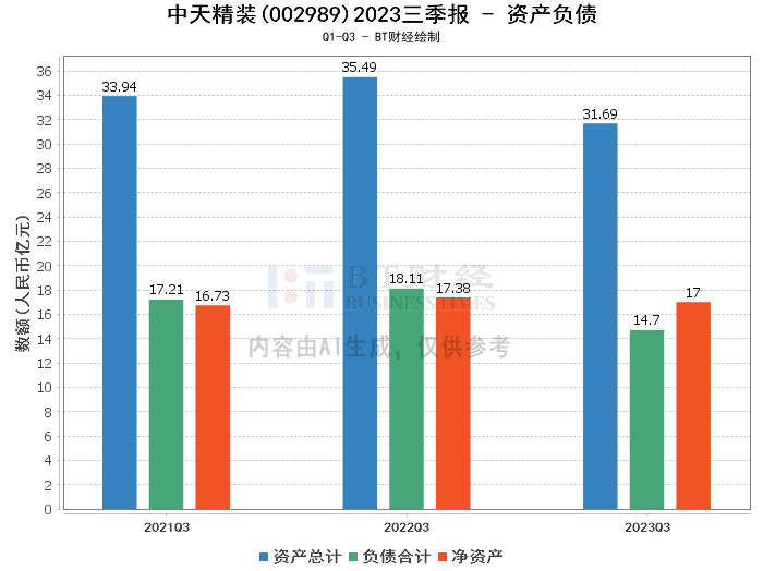 从资产负债表来看,截至2023年三季度末,中天精装的总资产为31.69亿元,相比上年度末的36.24亿元减少了12.54%。负债总额为14.7亿元,较上年度末的18.6亿元下降了20.97%,净资产则为17亿元,较上年度末的17.64亿元略有减少。资产负债率从上年度末的51.33%降至46.38%,反映出公司在降低财务风险方面取得了一定成效。