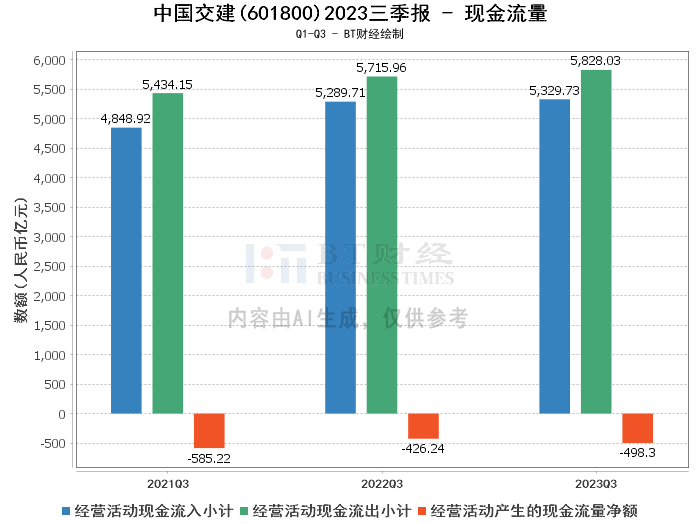 综上所述,中国交建在2023年三季度展现了稳健的增长态势。尽管现金流量净额有所下降,但营业收入和净利润的增长表明公司的核心业务仍然保持了良好的盈利能力。资产负债率的适度上升也在一定程度上反映了公司为实现长远发展所做的战略性资本投入。