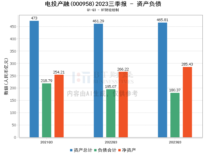 在资产负债方面,电投产融2023年三季报显示,公司总资产达到465.81亿元,相比上年度末的461.91亿元略有增长。负债总额为180.37亿元,较上年度末的181.78亿元有所下降。净资产则从上年度末的280.13亿元增长到285.43亿元。资产负债率从39.35%降至38.72%,显示出公司财务结构的稳健性有所增强。
