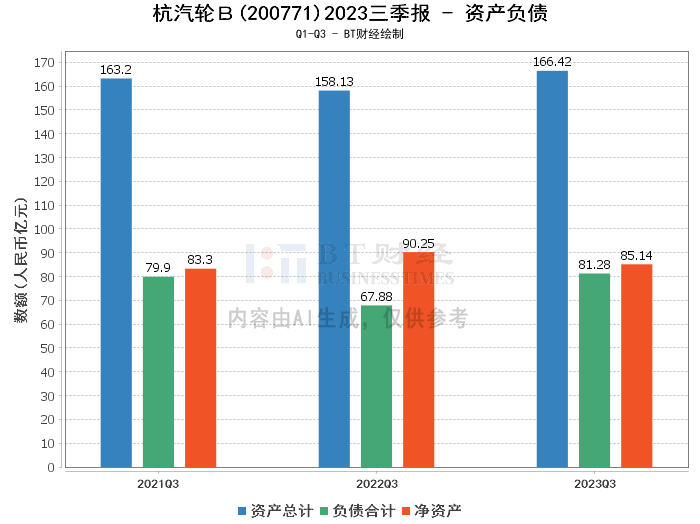 从资产负债表中可以看出,截至2023年三季度末,杭汽轮B的总资产达到了166.42亿元,相比上年度末的153.75亿元增长了8.24%。负债合计也有所增加,从上年度末的64.76亿元上升至81.28亿元。净资产则从上年度末的88.99亿元降至85.14亿元,资产负债率从42.12%上升至48.84%,反映出财务杠杆的增加。