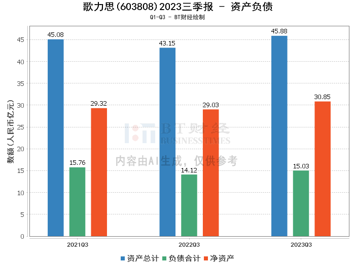 在资产负债方面,歌力思截至2023年三季度末的总资产达到45.88亿元,相较于上年度末的43.43亿元,增长了5.64%。负债合计为15.03亿元,较上年度末的14.79亿元略有上升。商誉保持稳定,为2.95亿元。净资产则从上年度末的28.65亿元增加到30.85亿元,资产负债率由34.04%降至32.76%,显示出公司财务结构的稳健。