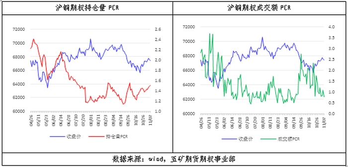 持仓量PCR位于1.00以上且同比回升,反映短期看涨情绪略有恢复。11月7日,看跌持仓量49651张,较上月同期减少172张;看涨持仓量33054张,较上月同期减少2226张;持仓量PCR收于1.50,位于1.00多空情绪临界值以上,反映在铜价处于66000元/吨附近时情绪面偏多;卖出看涨期权持仓量同比减少,导致持仓量PCR数值较上月同期回升0.09,反映看涨情绪略有恢复。