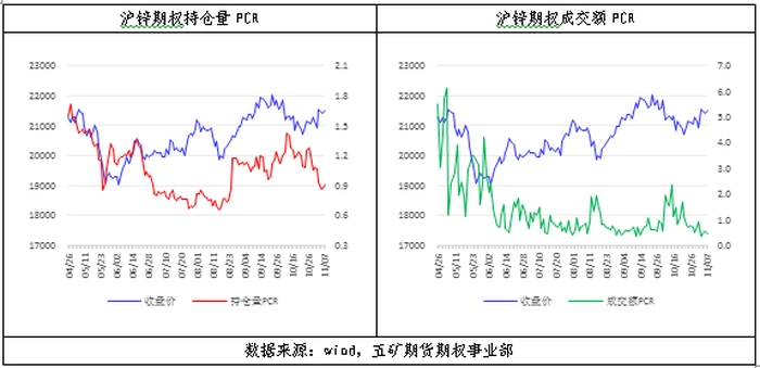 沪锌期权隐含波动率低位波动,市场保持观望。9月至10月,沪锌二次探底位置较此前明显回升,并且逐渐走出下跌通道,但反弹受阻上方压力位未能突破,继续观察短期上涨动能。沪锌期权隐含波动率维持一个月以来历史较低位置水平窄幅波动,11月7日报收于15.13%,反映市场对锌价后市走势保持观望。