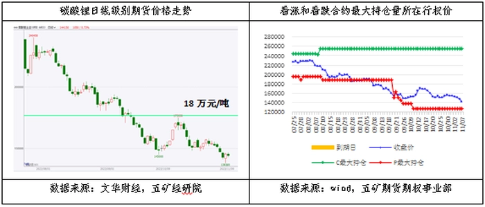 期权市场预期年底碳酸锂价格难以突破18万元/吨。从碳酸锂期权最大持仓量所在行权价来看,看涨期权所在行权价维持在较高位置,而看跌期权所在行权价不断下移。11月7日,LC2401合约看跌期权最大持仓量所在行权价为12.8万元/吨,是有市场成交量的最低可交易价格,期权费1250元/吨,看涨期权较大持仓量所在行权价为18万元/吨、20万元和25.6万元/吨,期权费分别是220元/吨、60元/吨和40元/吨,市场预期年底碳酸锂价格难以突破18万元/吨。