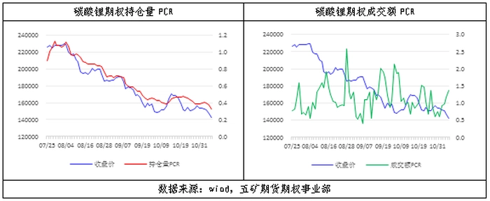 成交额PCR快速上升,看跌期权成交额更为活跃。11月7日,看跌成交额4106万元,看涨成交额2974万元,成交额PCR报收于1.38,较上月同期大幅度上升0.33,反映伴随着碳酸锂价格持续下跌,看跌期权成交量更为活跃,期权短线交易偏向逢高做空。