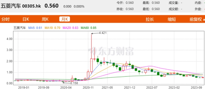 在此之前市场早有传言五菱要推出轿车,受此影响五菱汽车的股价在近一月内有较大回升,11月6日盘中一度大涨近19%,最高报0.63港元创近2个月新高价,但和高峰值的4.421港元相比,跌幅达87.3%,股价长期低于1港元。其18.47亿港元的市值在一众高市值车企中略显“寒酸”。