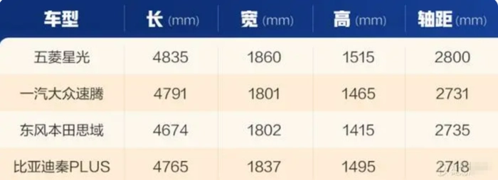 五菱星光分为混动和纯电两个版本,两个版本的设计语言仅在前脸部分有所区分,其他部分则保持一致。据官方数据显示,五菱星光长宽高各4835mm、1860mm和1515mm,轴距为 2800mm,这一配置在A级轿车中较为奢侈。以一汽大众速腾和东风本田思域以及比亚迪秦相关数据对比可以发现,五菱汽车的首款轿车竟然比这三款车型空间都大,直接对标B级车。