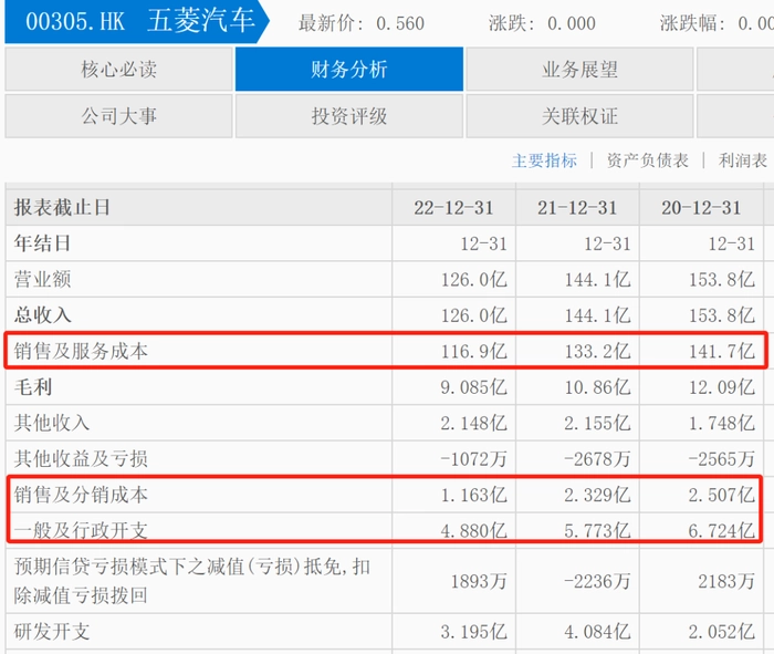 近三年五菱汽车的销售及服务成本费用分别为141.7亿元、133.2亿元和116.9亿元,2022年该项费用相比2021年减少了16.3亿元,同比下滑达12.2%。其中销售及分销成本也由2021年的2.329亿元降至2022年的1.163亿元,降幅超过50%,该项成本在2020年为2.507亿元,2022年相比2020年下降了1.344亿元。一般及行政开支由2021年的5.773亿元降至4.88亿元,减少0.893亿元,降幅为15.5%。需要注意的是,2022年五菱汽车的研发支出同样大幅下滑,由2021年的4.084亿元降至3.195亿元,减少0.889亿元,下滑了22%。在研发少投入近亿元,换来2261万元的利润,无法让市场信服。
