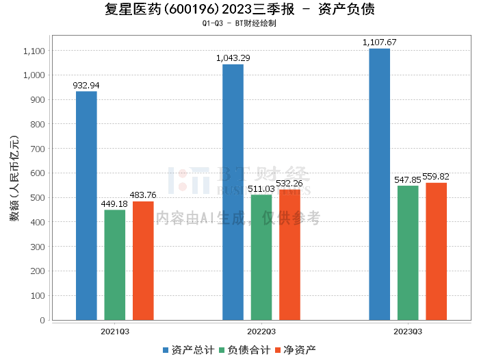 在资产负债方面,复星医药2023年三季报显示,截至报告期末,公司总资产达到了1107.67亿元,较上年度末的1071.64亿元有所增长。负债合计为547.85亿元,相较于上年度末的530.55亿元也有所上升。净资产则从上年度末的541.09亿元增加到559.82亿元。资产负债率略有下降,从上年度末的49.51%减少到49.46%,显示公司财务结构相对稳定。商誉的增加从103.37亿元到110.04亿元,反映了公司在并购和资产评估方面的活动。