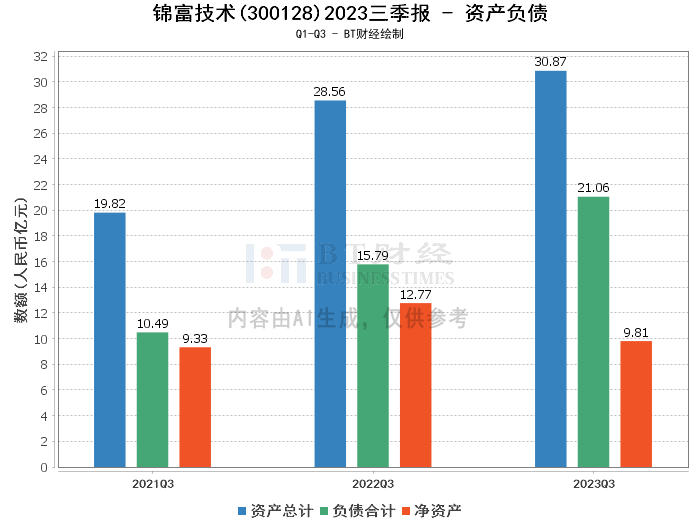 在资产负债方面,锦富技术2023年三季报显示,公司总资产达到30.87亿元,相比上年度末的28.49亿元增长了8.35%。负债合计为21.06亿元,较上年度末的18.08亿元上升,净资产则从上年度末的10.42亿元降至9.81亿元。资产负债率从63.44%上升至68.21%,反映出公司负债水平有所增加。