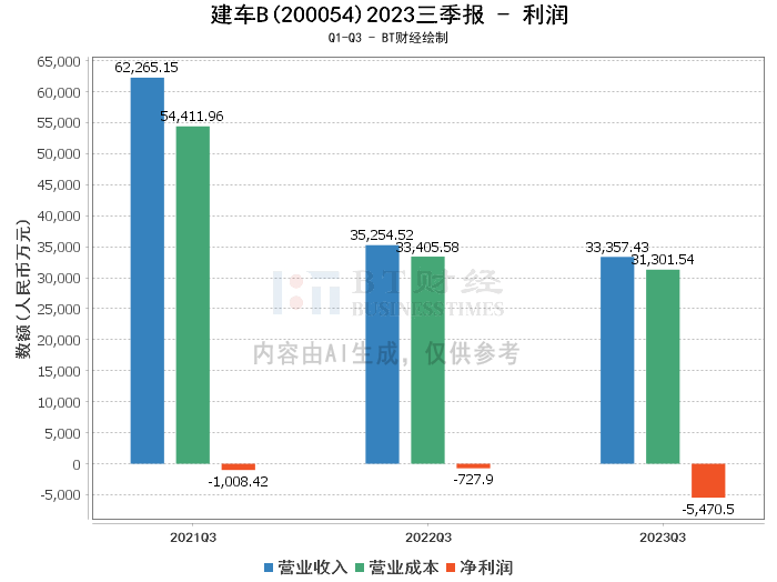 在利润方面,建车B在年初至本报告期末的营业收入为3.34亿元,相较于上年同期的3.53亿元减少了5.38%。营业成本则从上年同期的3.34亿元减少到3.13亿元。毛利率有所改善,从上年同期的5.24%提高到6.16%。归属于上市公司股东的净利润为-5470.5万元,较上年同期增亏4743万元,主要原因是上年度同期公司有一次性处置收益以及研发投入的增加。