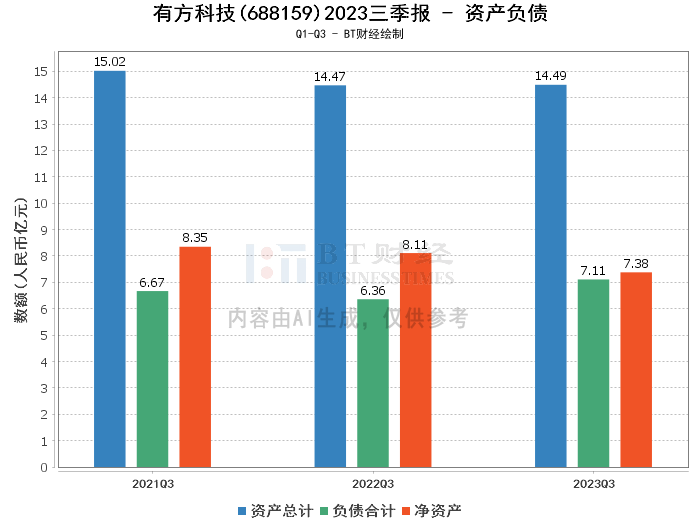 从资产负债方面来看,有方科技2023年三季度报告显示,公司总资产达到了14.49亿元,相比上年度末的13.67亿元增长了5.97%。负债合计为7.11亿元,较上年度末的5.91亿元增加,净资产则有所下降,从上年度末的7.76亿元减少到本报告期末的7.38亿元。资产负债率由上年度末的43.21%上升至49.07%,显示公司财务杠杆有所增加。