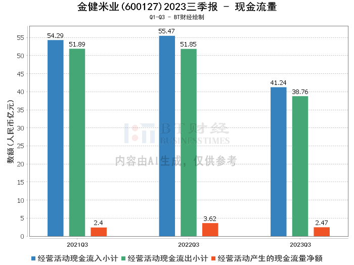 现金流量方面,金健米业的经营活动产生的现金流量净额从上年同期的3.62亿元减少至2.47亿元,变动幅度为-31.65%,主要是由于销售商品收到的现金同比减少所致。