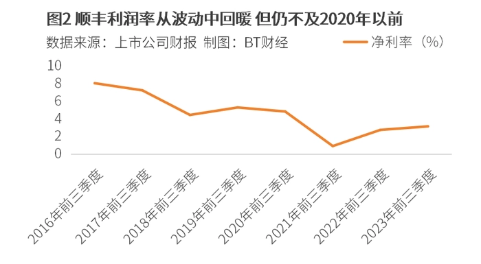 BT财经数据通梳理发现,公司利润率虽然仍在恢复中,但仍远不及2016年的水平。数据显示,2023年前三季度,顺丰净利率录得3.17%,较2021年前三季度和2022年前三季度的0.93%和2.77%稳步回升,但仍不及2016年—2020年同期稳定高于4%的水平。