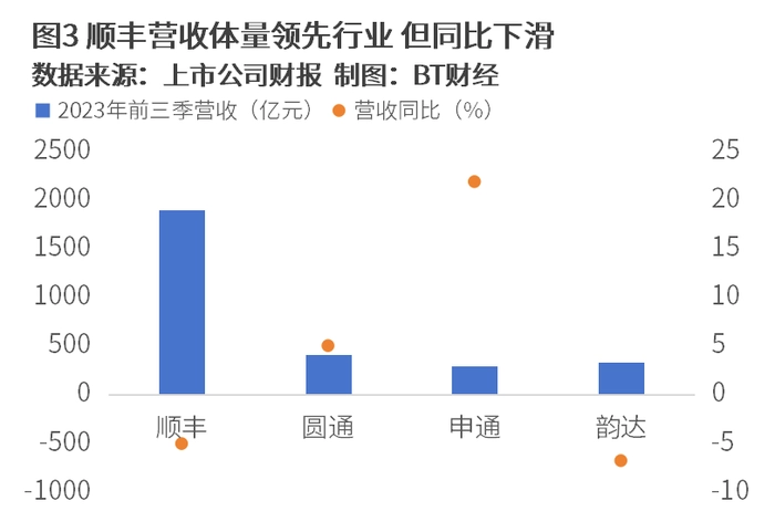 顺丰的营收同比指标从2022年年报开始录得萎缩,这与行业的整体趋势大致保持一致。从最新的2023年三季报纵观快递业,在“价格战”拉低单票收入、步入季节性单季的影响下,几大快递公司业绩普遍低迷。