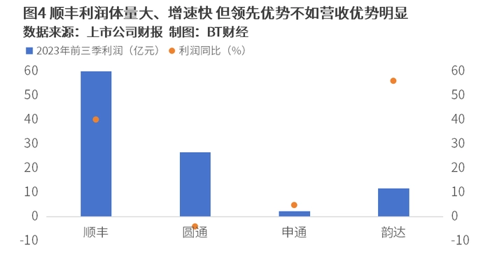 横向比较营收可以发现,顺丰体量仍是行业老大哥,遥遥领先于圆通、申通、韵达。但顺丰大体量之上的增速出现下滑,表现不如申通前三季度21.84%的营收增速。