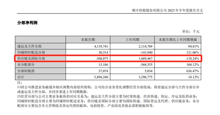 有些尴尬的是,大力布局的国际业务正在成为拖累顺丰增长的负面因子。以上述中报数据为例,2023年上半年顺丰“供应链与国际分部”收入同比缩水36.31%、净利润由盈转亏缩水118.24%。
