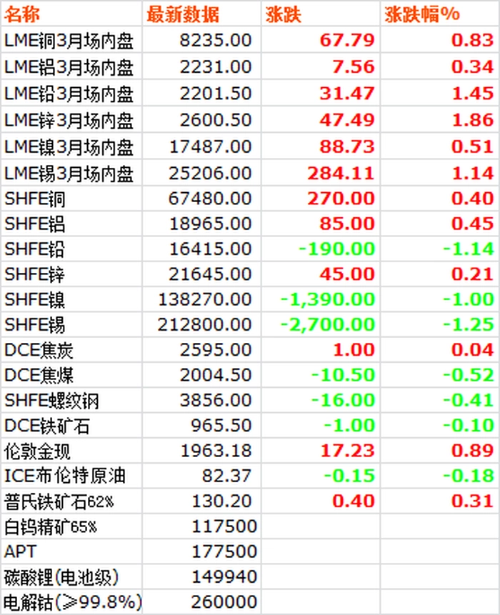 11月14日,LME六种基本金属价格全线上涨,锌铅领涨大盘。三月期铜价冲高回落,收于8235美元/吨,上涨0.83%。三月期铝价收于2231美元/吨,上涨0.34%。三月期铅价先抑后扬,收于2201.5美元/吨,上涨1.45%。三月期锌价晚间快速上行,收于2600.5美元/吨,上涨1.86%。三月期锡价收于25206美元/吨,上涨1.14%。三月期镍价收于17487美元/吨,上涨0.51%。