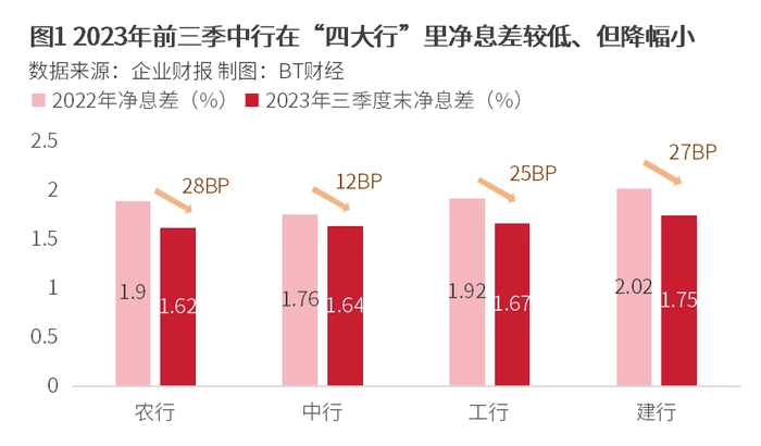 在银行盈利的关键指标“净息差”上,BT财经数据通查询发现,在四大行中,2023年前三季度,中国银行在四大行中净息差的绝对值较低,仅仅略高于农业银行;但好在降幅是四大行中最小的一个,较2022年末下降12BP,降幅远小于另外三家大行。