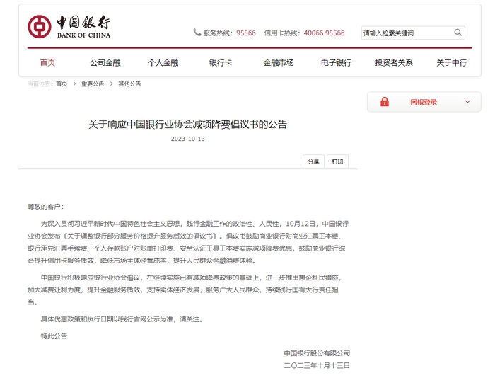 另外,“中国银行们”领军的银行业还在继续出让利润,新一轮“减费让利”又已在路上。10月12日,中国银行业协会官网发布《关于调整银行部分服务价格提升服务质效的倡议书》,提出了取消商业汇票工本费、降低银行承兑汇票手续费等倡议。倡议发出后,几大国有银行纷纷响应,中国银行10月13日发布公告表态支持。